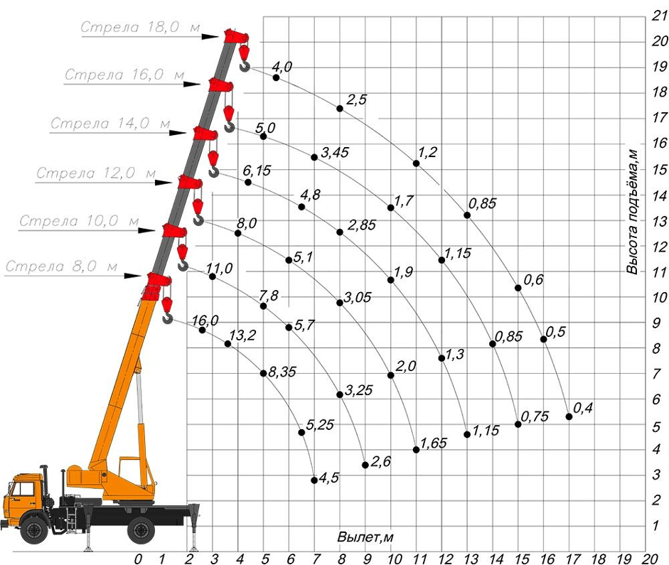 Важно: грузоподъёмность зависит от вылета стрелы. Чем дальше от кабины висит груз, тем меньше максимальный вес. Это отражено в грузовысотных таблицах для каждой модели.